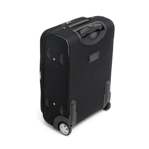 Product Description: Travel Trolley in 600D and EVA with semi-rigid front compartment and lined interior. Identification tag on the back. Extendable aluminium handle with spring. The trolley has a capacity up to 28 L and weighs 2'95 kg. 345 x 520 x 195 mm