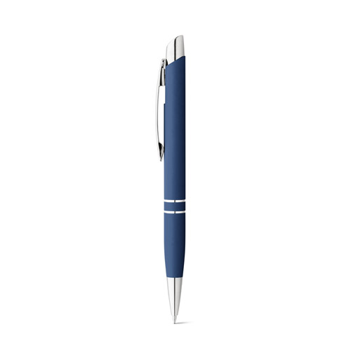 Product Description: Aluminium ball pen with rubber finish and clip. Blue ink. ø11 x 139 mm