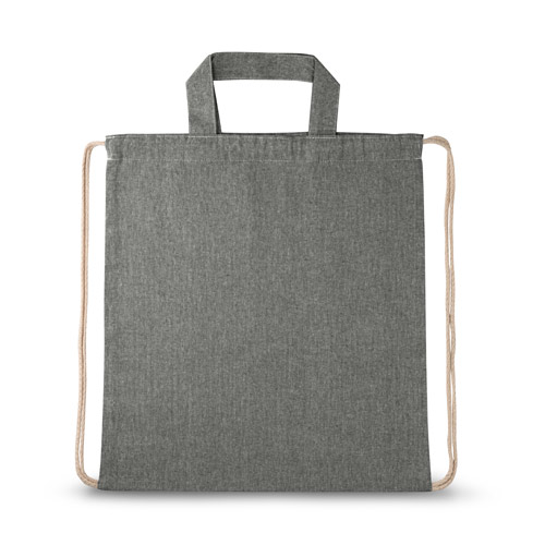 Product Description: Drawstring bag with recycled cotton (70%) and polyester (30% rPET) (140 g/m²), 30 cm handles and cotton cords for closure. Recycled cotton is undyed. The raw material is used in its original form and color, without the use of dyeing or bleaching chemicals, contributing to a lower impact. 370 x 410 mm