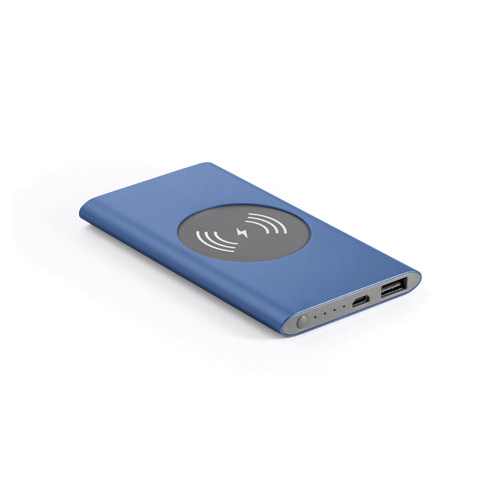 Product Description: Power bank with wireless charger made from recycled aluminium (100% rAL). Portable battery with 4.000 mAh capacity, charge level indicator, one USB-C input port, one USB-A output port and 5W wireless charging power. Compatible with mobile devices with wireless charging technology. Includes a USB-C charging cable. Supplied in a gift box. 123 x 70 x 10 mm